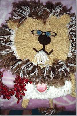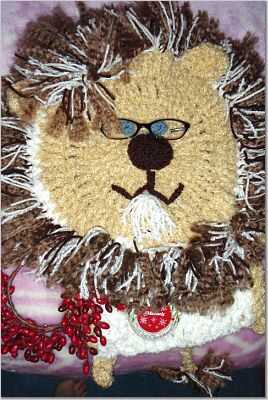 La nariz es sólo un círculo marrón oscuro que imita la forma de la nariz que sobresale un poco en la cara. Sólo va bien en la parte superior de la protuberancia como un sombrero de cráneo cabe en una cabeza. Los ojos son círculos más pequeños en hilo azul. La boca se hace haciendo una cadeneta y luego añadir una fila más abajo para darle sólo el espesor adecuado. * Dejar las colas largas en las piezas de la cara como los utilizas para anclar en el lugar. Sólo utilicé el ganchillo otra vez para tirar el hilo a través de los agujeros, atar las colas de lo hilo juntos en el interior. He creado la barba utilizando el mismo método como la melena. Tenía un viejo par de anteojos que pegué a través de los orificios en el lugar deseado para darle un toque personal ya que mi compañera lleva gafas similares. Para la cola otra vez use los hilos del mismo como la melena y lazo en el extremo de la cola. Para que sea más navideño he añadido una guirnalda de arándanos del faux que cosí su pata todo. Luego añadí un ornamento de la Navidad como una especie de placa de collar. Usé cinta que até bajo el principal para el cuerpo en lugar de atar alrededor de la cabeza como un collar de la real. Las imágenes aquí muestran el adorno con el papel de Michael original en él sin embargo, retirado y sustituido con un pedazo de papel cortado a la medida con el nombre de mi compañero de cuarto en él.