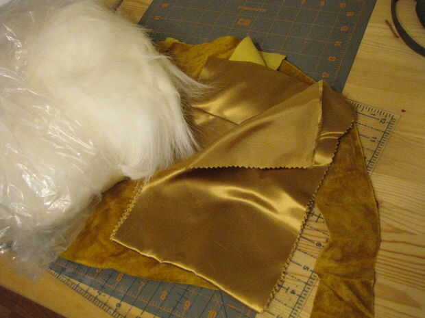 Fregó mi montón de tela algo verde y scaley. No hay tal suerte. Terminé eligiendo un arrugado trozo de terciopelo oro y Satén elegante oro así como un pedazo de piel de disfraces de Halloween del año pasado la diversión. () yo quería algo bueno de 'glam' ya que es una media de la Navidad. No lo quiero demasiado feo tener dando vueltas!