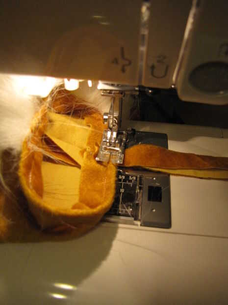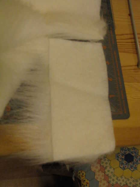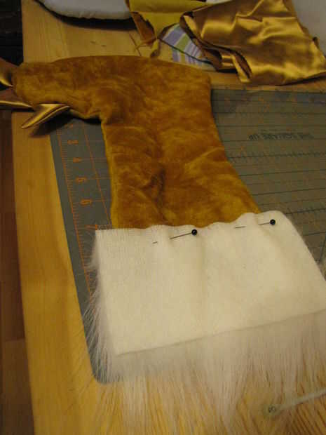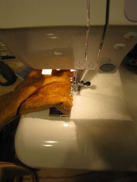 Sólo quería un rectángulo de piel adorno a un lado. Si usted quiere que vaya todo el camino alrededor, sólo deberás retocarlo un poco en este paso. Corte mi rectángulo y lo colocó en la media, derecho contra derecho juntos. Desea que el pelaje que domina la mayor parte de la siembra, para que cuando usted tirón hacia atrás sobre sí mismo, cortinas por sobre la media. (ver notas de imagen...) Alfileres en su lugar, doblar sobre el borde de la media al mismo tiempo. Coser todo alrededor, a través de la diversión capa de piel y terciopelo.