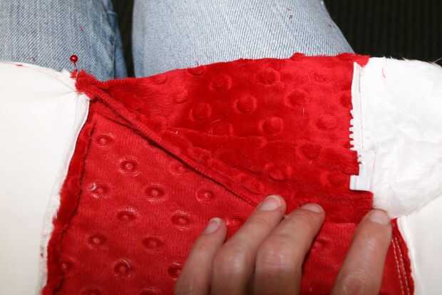 • PIN juntos abierto borde con los dientes de la cremallera todo hacia las partes de rojo (tela principal)