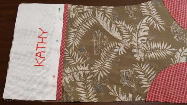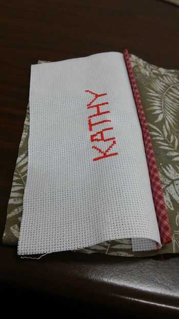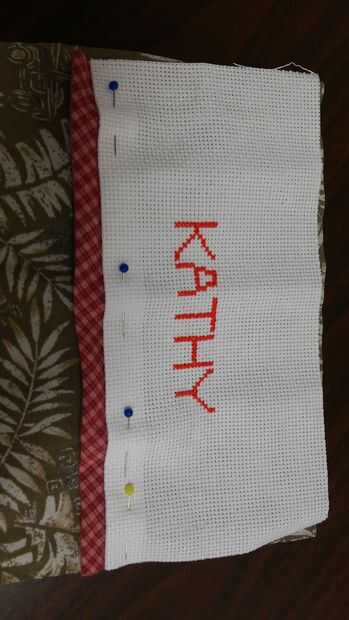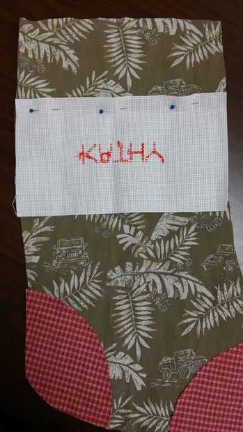 La banda de nombre en la sección delantera de la media en el borde superior del perno. Poner bajo el borde inferior y colocar el borde de la moldura doblado entre la banda de nombre y de la tela. Prensa. Plegar la tela Aida y coser todo el borde doblado. Traer la tela Aida hacia arriba hacia la parte superior. Usando un decorativas puntada en su máquina de coser o bordar con una puntada de pluma a través de la banda de nombre aproximadamente 1/2" desde el borde inferior.