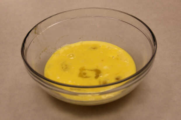 Mientras que la corteza está en el horno, untar el bol o recipiente con la mantequilla, margarina o aerosol de cocina. Combinar los huevos, leche, sal y pimienta negra. Mezclar bien con un tenedor.