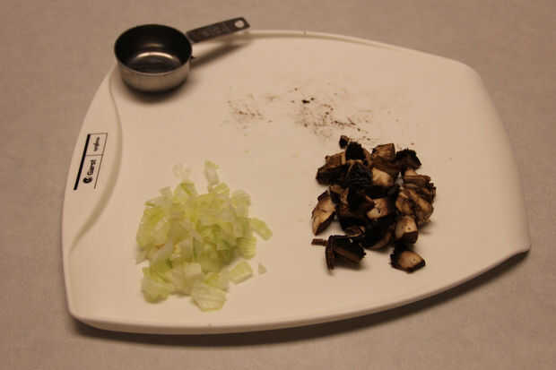 Si utiliza champiñones frescos, cebolla o pimientos verdes como yo, córtelos con un cuchillo y reservar.  He utilizado sobre un 1/4 de una cebolla amarilla y mitad un hongo de portobello. Prefiero cebollas amarillas por su sabor dulce. No tengo ningún pimiento en esta receta debido a mi propio gusto personal. Si usted decide utilizar champiñones enlatados Asegúrese de escurrir antes de añadirlos. Estos son ingredientes opcionales si usted o alguno de su familia tiene una aversión de uno o más de estos.