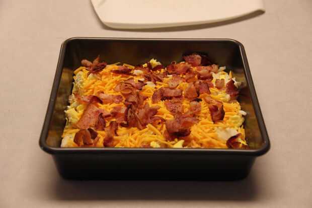 ingredientes 12 huevos, pan, setas, queso rallado, pimienta negra, todos condimentos salados, espalda o bacon bits.Paso 1: Preparar los huevos Precalienta el horno a 350 para empezar comienzo por revolver 12 huevos en un bol. Luego viértalos en la sa