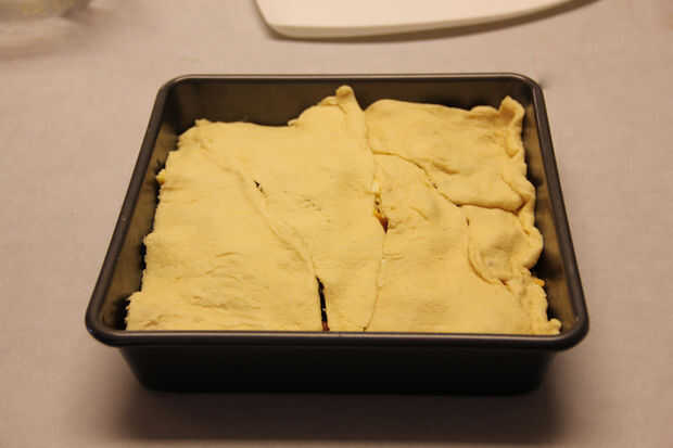 Con el restante paquete de rollos de media luna, cubre la parte superior. Una vez más que sólo necesita una capa para cubrir el la hornada pan como se muestra en la figura anterior. Cualquier masa adicional puede utilizarse para un lado de la media luna (ideal para aquellos miembros de la familia o compañeros de piso que no pueden conseguir bastantes de ellos). Poner la bandeja en el horno durante 12-15 minutos o hasta que la corteza se dore.