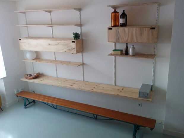 Nos encontramos con un banco de gimnasio de la vieja escuela en la tienda y se aplicar exactamente nuestro muro! Pensó que sería cool a mediados del siglo la pared sistema con eso pero los precios eran muy altos! Además, la mayoría de los colores no coincide con bien. Así que decidí hacer uno yo mismo. Fue un proyecto muy fácil y me tomó sólo media jornada. El estante más bajo es un poco más que el resto, así que podría funcionar como una mesa de juego de escritorio para nuestro hijo!