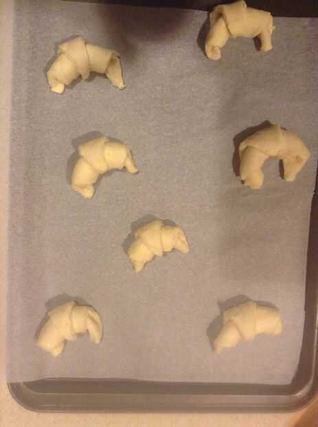 Doblar la base de una forma minúscula hasta el triángulo y enrollar el resto del camino. Ser muy suave. No aplaste las capas de mantequilla. Entonces forma las de cruasanes en medias lunas. Recomiendo dejarlas subir durante 2 horas, sin embargo, hacer esta receta de compañeros de casa impaciente me ha enseñado que este paso no es absolutamente necesario. Obtendrá todavía flakey, mantecosa croissants sin él. Ligeramente cepille huevo batido sobre croissants si quieres croissants marrón brillantes agradables (de lo contrario lucen un poco pálido y sin brillo pero todavía podrá degustar fantásticos).