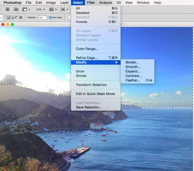-Una vez que haya usted está seleccionado utilice la opción de "Pluma" para suavizar la selección. Para ello vaya a "Select" > "Modificar" > "Pluma"