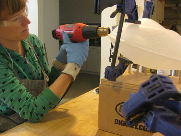 Luego me puse a pegar las dos mitades. Esto implicó la abrazaderas de correa, abrazaderas de gatillo, cemento acrílico y un montón de calor con la pistola de calor. Oh y paciencia.