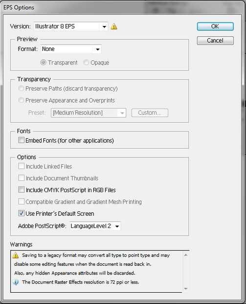 Tienes que guardar como eps versión 8. Desactive casi todo lo demás. Utilice las opciones que se muestra en la imagen adjunta.