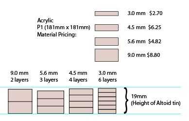 La altura interna de un Altoid tin es unos 19mm. En páginas de material de Ponoko, 3mm que acrílico grueso parecía un buen ajuste. Necesito 6 capas de material de 3mm me acercarse a la altura deseada de la lata de Altoid, parecía menos que óptima. Sacó algunas mediciones rápidas. (Ver imagen) Me di cuenta que podía sólo encajo cuatro plantillas en la plantilla de P1, por lo que miré el siguiente grueso disponible para ese tipo de plástico. El espesor 4,5 mm era el tamaño siguiente para arriba. En ese espesor, sólo necesitaba 4 capas de material para acercarse a la altura de 19 mm de la lata.