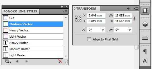 Nota: Para obtener the0.01mm grosor de la línea para que funcione correctamente, antes de peinar algo, debe seleccionar todos los objetos en la página, luego abrir la paleta transformar y desmarque la opción de alinear a la cuadrícula de píxeles. Si esto se comprueba, el más pequeño movimiento que puede asignar será 1px, que no se imprimirá en cortadoras de láser de Ponoko.