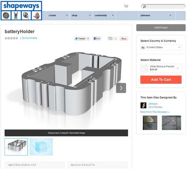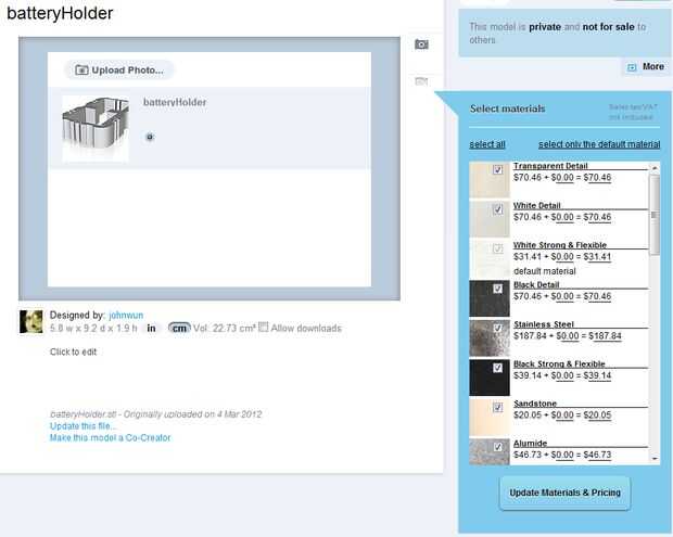 Usé al uploader en la web en shapeways.com para verificar mi archivo. Después de 3 minutos o menos, recibí un correo electrónico automatizado diciéndome que no había ningún problema con mi archivo, y que era bueno para ir. Volví a la "mis modelos" sección en shapeways.com y encontró que había hecho un bonito 3D prestados imagen de mi modelo terminado, junto con una etiqueta de precio muy razonable ~$30.00 (con Shapeways, el pedido mínimo es de $25.00, pero el envío es gratis) he comprado el modelo y recibió la confirmación de que la orden fue aprobada.