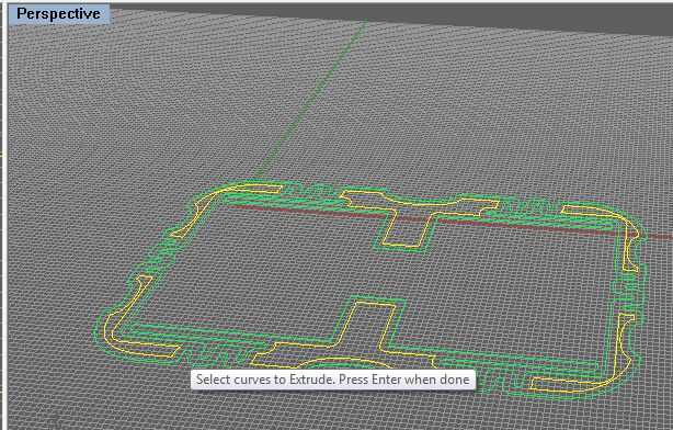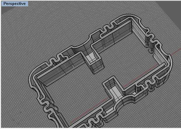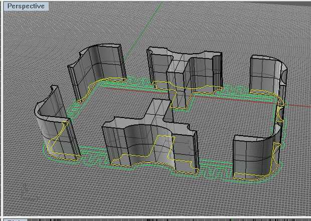 Con mis objetos creados, abrí el Rhino y había importado el archivo ai en el plano de construcción.  Ahora, en Rhino, sólo necesito realizar dos pasos. Necesito sacar las formas a la altura correcta y luego realizar una sustracción booleana para extraer la geometría del desplazamiento del centro, y mi modelo debe ser completo.