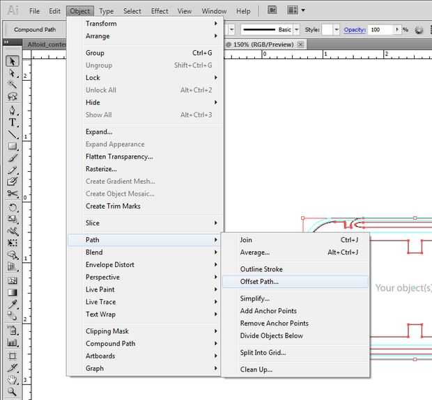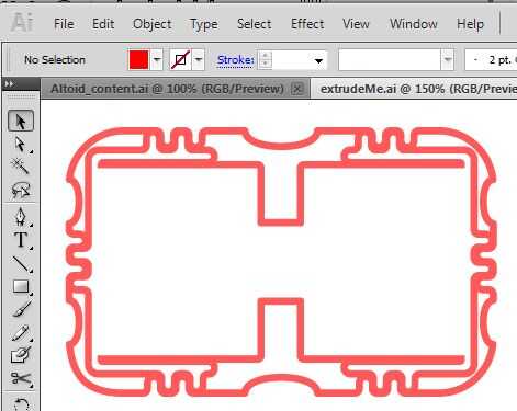 Descascarado objetos complejos puede ser extremadamente complicado en programas 3D, así que creado previamente la geometría 'hueca' en illustrator al realizar un offset negativo de 1,5 mm de mi forma de trazado compuesto. El comando "Offset" se encuentra en el "objeto > Path > Offset" desplegable en Illustrator. Una vez que había un desvío que no se superponen a sí mismo o cualquier otra cosa, combinado mi objeto en un único trazado compuesto (utilizando el botón "Menos frontal" en la paleta de Buscatrazos) y guardar mi archivo como Illustrator8.