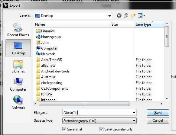 Una vez creado el modelo 3D, que desea exportar en un formato que puede leer una impresora 3D. Elegí stl (estereolitografía formato), que es un estándar de la industria. Para un modelo tan simple como esto, usé las siguientes opciones: