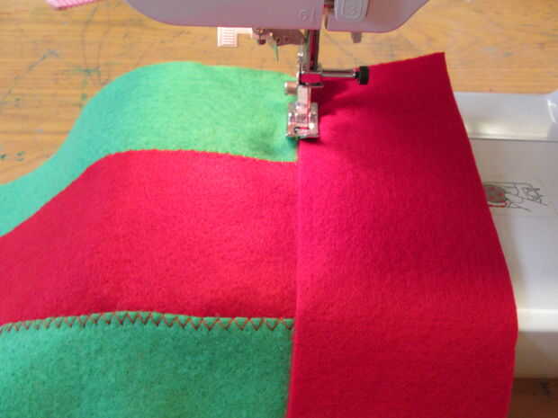 verde y rojo alternando cosen 9 tiras juntas, coloca una ligera ventaja sobre la anterior tira y utiliza una puntada de zig zag.