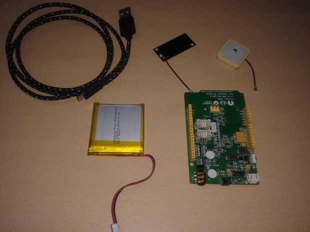 1) paquete de Mediatek Linkit una tabla con el Sensor GPS, batería y la antena GPRS.