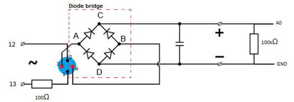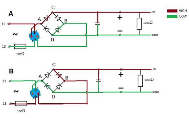 Debido a que se utiliza AC hay un puente de diodos como se muestra en la figura 1. Este puente de diodo se AC como entrada y la convierte en una corriente directa (DC) como salida. La conversión es necesaria para las mediciones. El dispositivo mide complementario sin la conversión. Por ejemplo cuando se suministra 5 voltios en la primera dirección se medirá 3 voltios. En la otra dirección 5 – 3 = 2 voltios se medirá.