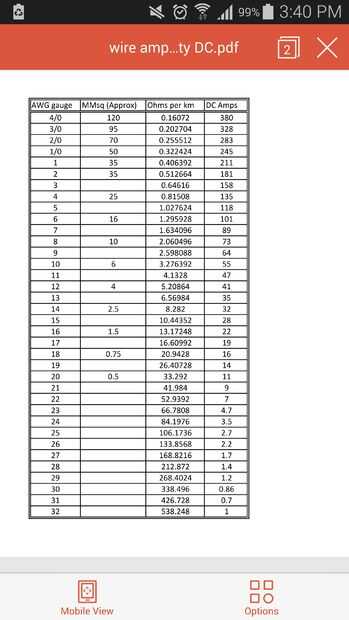 Bajo carga máxima el cableado sostiene muy bien. Nota el cable 6mmsq por sensor para pasar hasta 70 amps. Esto va a demostrar que la capacidad de CC de un alambre es significativamente mayor que la nominal AC. Por supuesto que hice mi investigación en el tamaño necesitado. Adjunta es la tabla de capacidad de CC de 90C cable.