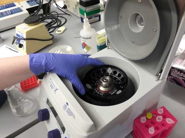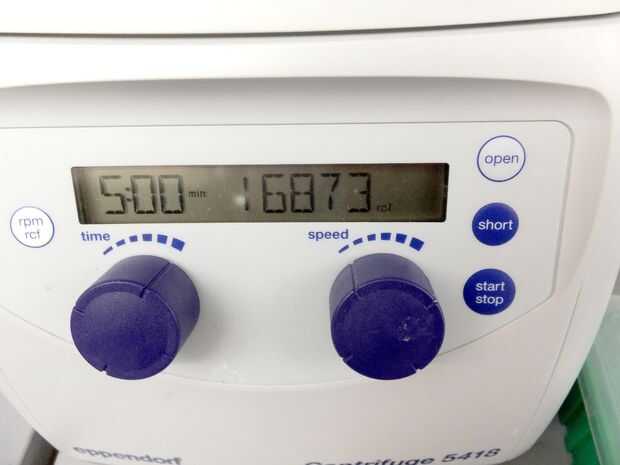 Poner el tubo de microcentrífuga en una microcentrífuga. Añadir un tubo de centrífuga con 1mL de agua para equilibrar la microcentrífuga, si es necesario. Cierre la microcentrífuga y ponerlo a correr a toda velocidad durante 5 minutos. Vea la figura 2. Una vez terminada la microcentrífuga spinning sacar tanto de los medios de comunicación alrededor de las bacterias como sea posible con la pipeta de 1mL (con una punta nueva para cada muestra). Desechar los medios de comunicación en un contenedor de residuos adecuado biomaterial.