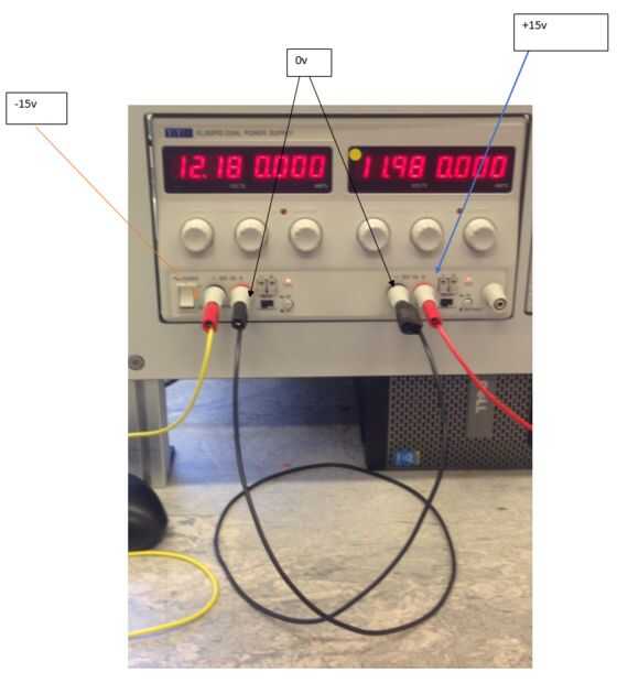 Nota Si no está familiarizado con +-15v debe unir el polo positivo de un lado de la fuente de alimentación dual a la terminal negativa de la otra, esto lleva dos puntos a 0v y arrastrando así la diferencia de potencial entre el lado conectado el polo positivo al negativo traerá su negativa terminal - 15v. Si esto está claro que he proporcionado una imagen que puede ayudar. Tenga en cuenta que también algunas fuentes de alimentación proporcionan un interruptor que pone la fuente de alimentación en serie.