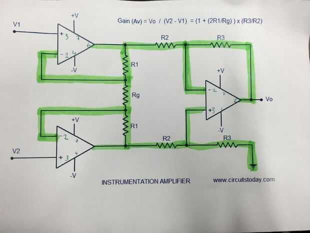 Para el amplificador de instrumentación, que se muestra arriba en la primera foto, elegir resistencias de los mismos valores para R1s, R2s y R3s como se ilustra en el esquema sobre el circuito. Un buen consejo mientras el circuito de cableado es utilizar un marcador resaltador y destacar cada paso de los cables que lo completes. También mantener tan limpio como sea posible para prever fallas más fácil encontrar el cableado.