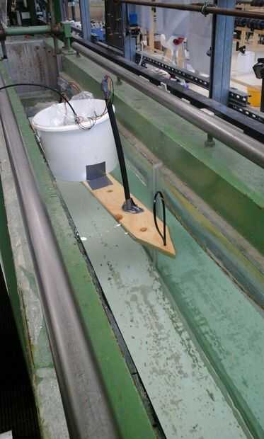 Para hacer este instrumento necesita un arduino (utilizamos: UNO), dos sensores de temperatura (TMP 36), una placa arduino, algunos cables y (opcional) una pantalla LCD. El primer paso es hacer tu temperatura sensores prueba del agua, que necesita para asegurarse de que la "cabeza" del sensor estará en contacto con el agua. Luego construir algo para fijar los dos sensores de temperatura, a la misma profundidad y el mismo lugar en el agua. Utilizamos un trozo de madera con dos orificios en él. La profundidad de los sensores de temperatura es seis centímetros por debajo de la superficie del agua. La distancia entre los sensores de temperatura es de 10 cm en la dirección de la corriente.