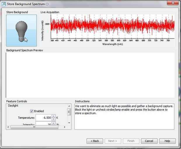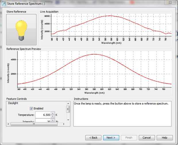 En vista al mar es necesario seleccionar el modo de reflectancia en el Asistente para la espectroscopia. Luego tienes que configurar los niveles de referencia para la reflexión. El máximo nivel de reflexión ocurre cuando la luz incidente es igual a la luz reflejada y el nivel mínimo de reflexión se produce cuando no hay luz en absoluto.