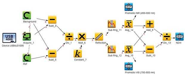 La primera imagen muestra el flujo de datos completa para la medición de reflectancia NIR las gamas Visible y también el NDVI.