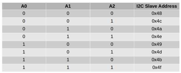 En este caso la parte difícil es la solución con resistencias que hice. Inicialmente voy a conectado A0, A1 y A2 a tierra. De esta manera la dirección I2C asignada a LM75A será 48. Echa un vistazo a la lista de los 8 diferentes configuraciones disponibles para la dirección.