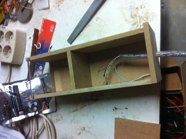 En primer lugar hacer muescas poco a aproximadamente 1 cm del extremo para el plexiglás en. El siguiente paso es hacer 4 agujeros en la pieza de madera de 9 x 9 cm, es donde se instalarán los sensores de luz. En la otra pieza de madera 11 x 11 cm solamente un agujero debe ser perforado, esto es para que el cable entrar en el interior del sensor. Asegúrese de que este agujero es más o menos el mismo diámetro del cable desde el sensor debe ser a prueba de agua. Cuando el sensor y los cables se construyen los lados del sensor pueden ser montados. Utilizamos pegamento y clavos. Para asegurarse de que la construcción es agua prueba uno puede llenar los agujeros con el mineral de pegamento envuelve para arriba en cinta. Los cables que están conectados a los sensores de luz y Arduino deben ser lo suficientemente largos para cubrir los distance(depth) que se desea medir en.