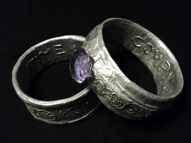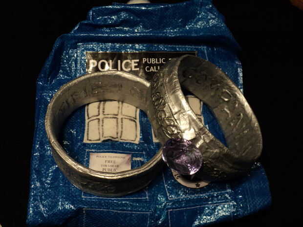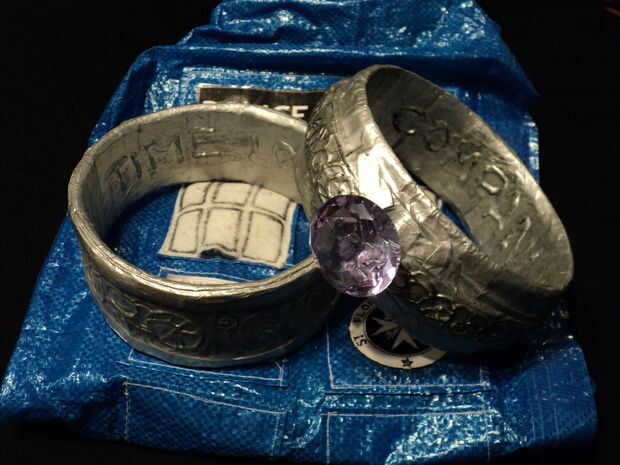 Estos anillos gigantes pueden ser una réplica del conjunto real de Doctor Who anillos que tenga. Las bandas se inscriben con tiempo Señor y compañero. Cercaron con texto de Gallifreyan de su elección. Banda de acompañante está adornada con una joya gigante.