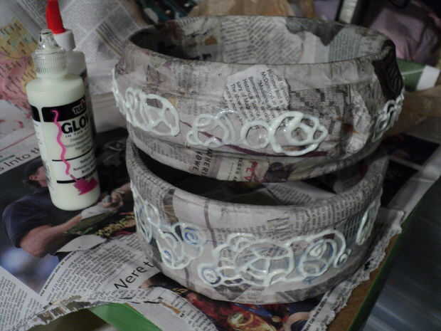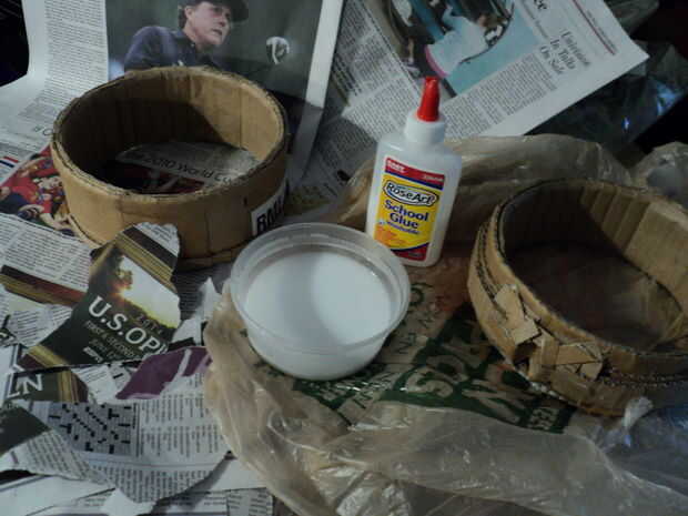 Mezcla de un recipiente pequeño de agua y pegamento. Mitad agua, mitad cola es buena. Mezclar con los dedos ya que tienes que sumergir trozos de periódico u otro papel de desecho en el pegamento y hacer su papel maché sobre el anillo entero.