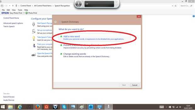 - Haga clic en "abrir el Diccionario de habla". Haga clic en o decir "agregar una nueva palabra".