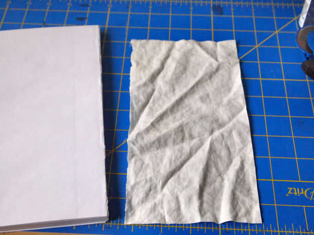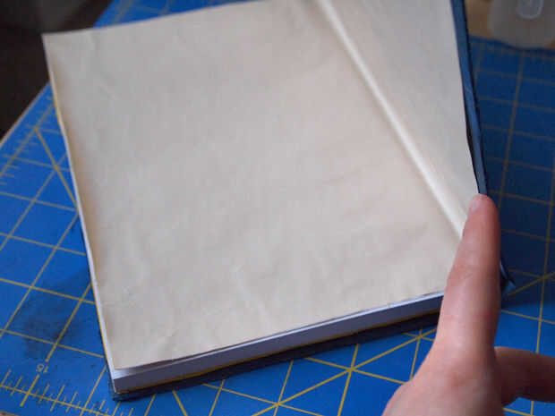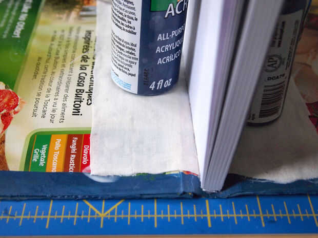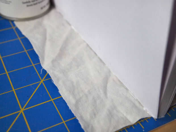 Ahora es tiempo de volver a poner el libro juntos.  No tengo mucha experiencia con encuadernación, pero afortunadamente hay bastantes instructables aquí sobre el tema (,).   Corté un trozo de tela que era tan largo como las páginas del libro y sobre 2 pulgadas de ancho.  Pegué la espina dorsal de las páginas del libro en el centro de la tela.  Una vez que ha secado el pegamento pegué la tela en el interior de la cubierta del libro (no pegar la columna vertebral a las alas de tela).  Una vez que ha secado completamente pegué una hoja grande de papel en el frente y hacia atrás dentro de la cubierta.