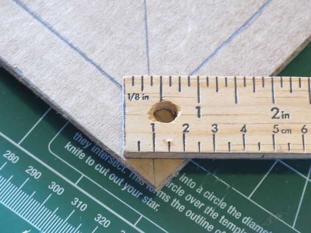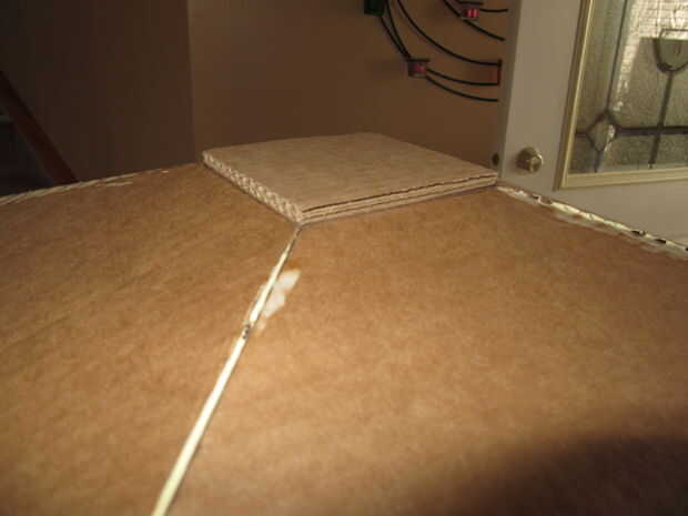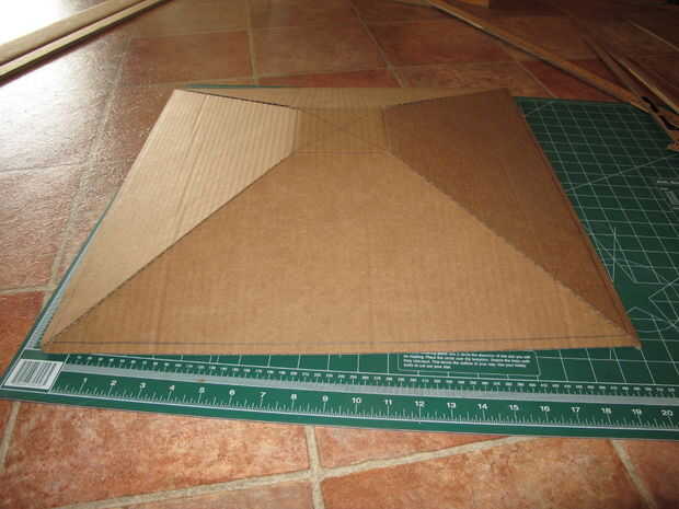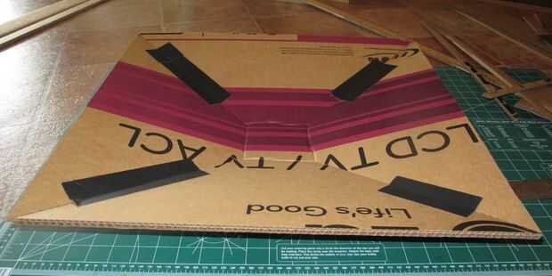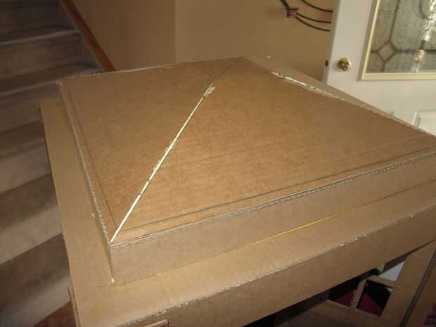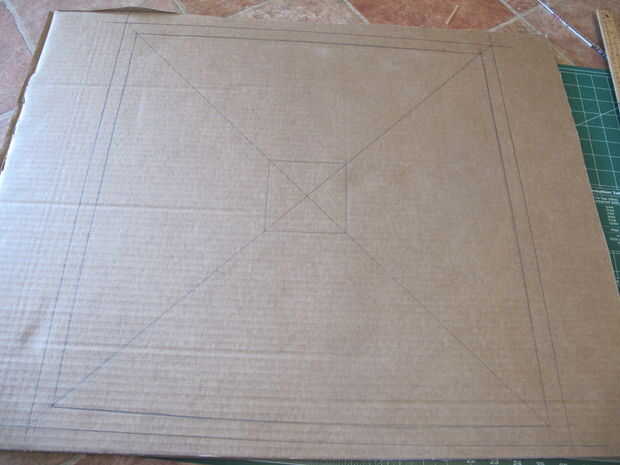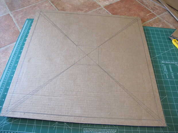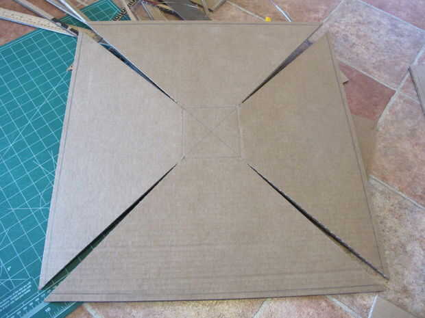 En la imagen con la regla, puede ver que hice una marca en las esquinas 1 cm a cada lado de la línea trazada en la esquina. Desde estas nuevas marcas que necesita dibujar una línea que conecta el borde de la cartulina a la esquina de la caja de 10 x 10 que fue dibujada en el centro. Como puede ver en las fotos que cortan estas líneas desde la esquina exterior a la caja del centro. Ahora doble los cuatro aletas del techo hacia abajo hasta tocar. Usé cinta de garfio, pero conducto o gorila cinta así (desea una cinta fuerte que no deja ir), para mantener las aletas de la cubierta juntos por el momento.