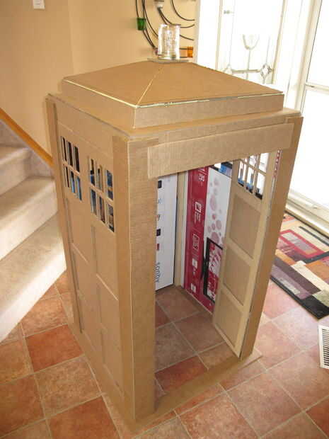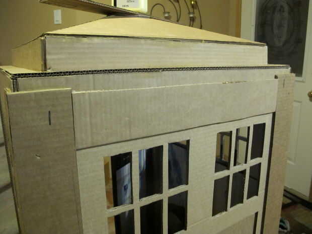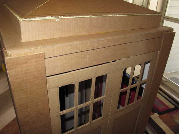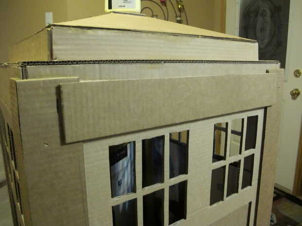 A continuación tomar una tira de completo 53 cm y céntrelo en la Tardis. Pegar en el mismo nivel de la parte superior como la pieza anterior. Se trata de la Junta se colocará el signo de la caja de policía. Para ello en los cuatro lados de la Tardis.