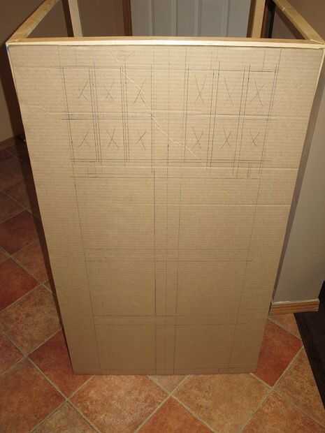 Una vez tuve mi hoja tuve que trabajar en las dimensiones de los detalles de la puerta (paneles y ventanas). Midió la altura (103.5 cm) y ancho (64 cm) y luego trabajó dimensiones para hacer los ocho paneles de igual tamaño. Las ventanas cuentan como paneles como sus dimensiones son las mismas que un panel.