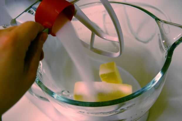 Comenzar por batir la mantequilla y el azúcar hasta que se convierte en una mezcla liviana y esponjosa.