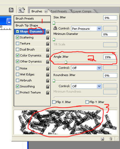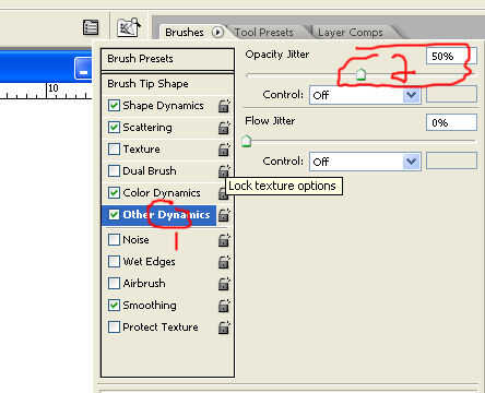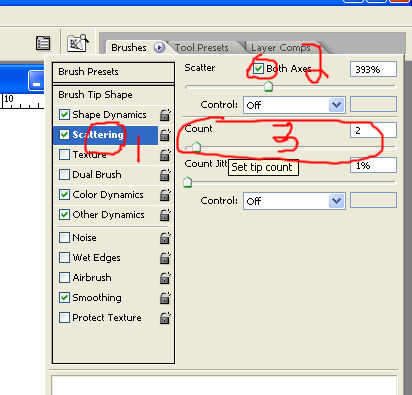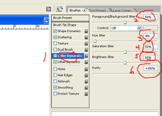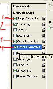 b. en la paleta de pincel dejar cualquier defectos analizados (probablemente suavizado), pero también haga clic en estas cajas extra 4 por lo que tienen marcas de verificación: dinámica de la forma, dispersión, dinámica del color, otra dinámica