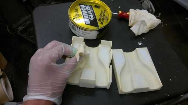 4. Limpie el interior de su molde con liberación de molde. He utilizado cera de liberación de molde base de carnauba de Meguiar. Cera, espere hasta que el cura y la cera apagado. Aplicar varias capas de cera y aplicarlo a todas las superficies – epoxi comenzará a gotear todo cuando usted fije sus moldes en su lugar, y realmente no quieres que pegue.