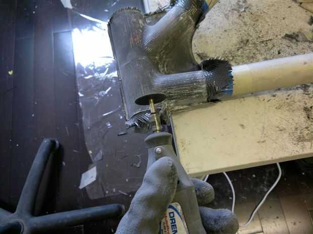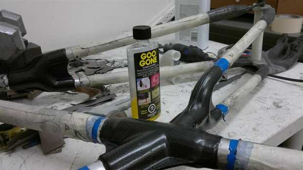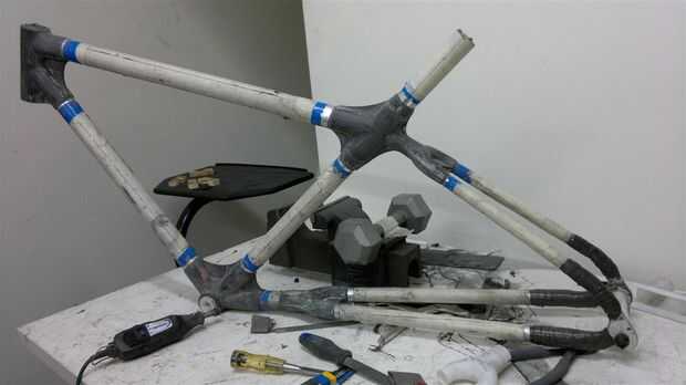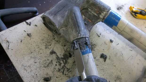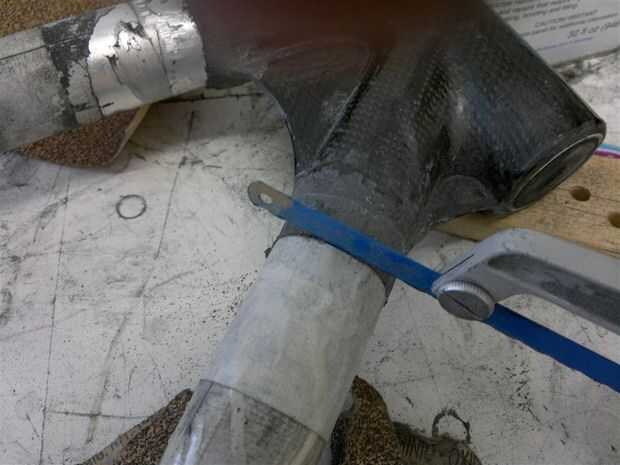 Para los bordes irregulares que están alrededor de los tubos, la Dremel también viene bien. Si usted quiere conseguir un bonito borde recto donde el carbono se une con el tubo, puede envolver un trozo de cinta alrededor del tubo como una guía y luego muy cuidadosamente con un mini arco de sierra para marcar un corte en la fibra de carbono alrededor de todo el camino. Parar al golpear la capa de fibra de vidrio (que no quiere cortar el tubo metálico y dañarlo). Una vez que has anotado el tapajuntas alrededor, un cuchillo o cincel (no en ángulo para que hoja se verá obligado a lejos del tubo, cavar en él!) le quite lo relativamente sin dolor.