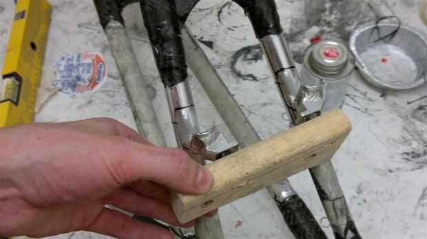 Luego utilizar alguna masilla Masilla epoxy metal de alta calidad y poner una capa en la parte posterior de ambos de los jefes. Luego apreto éstos contra mis tirantes, presionando duro exprimir el exceso de masilla pero lo que le permite llenar los huecos entre el jefe y el sillín, creando un vínculo sólido. Asegúrese de que se mantenga la alineación apropiada, porque el metal epoxi configura rápidamente (generalmente 10 minutos).