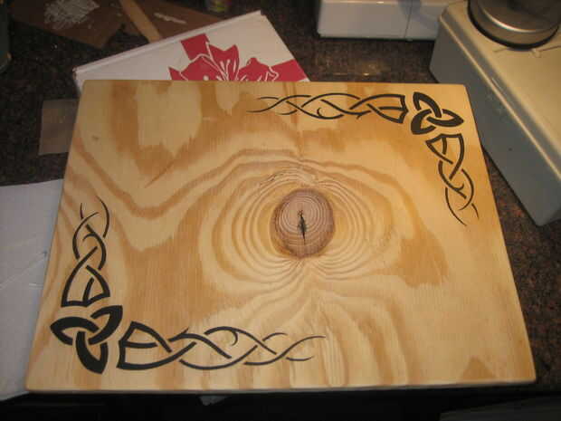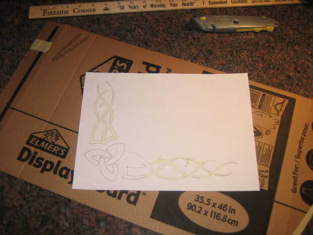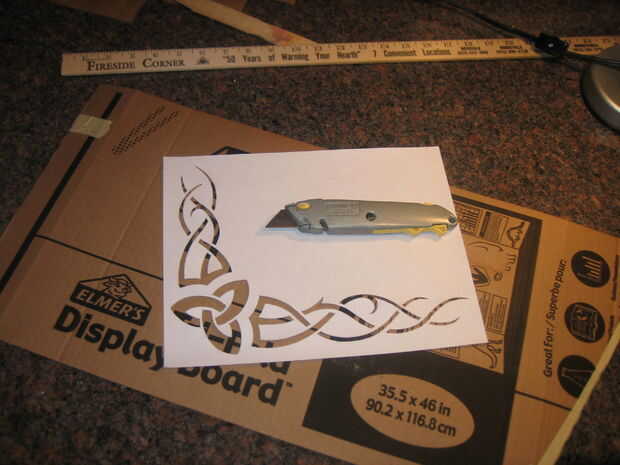 Ya que no tengo una Zing o las herramientas para grabar o burn de madera, elegir pintar mi diseño a mano. Para empezar, dibujaba un boceto del diseño y utiliza software de edición de imágenes para tocar para arriba y hacer ajustes finos. Luego imprimir el diseño sobre el papel y comprueba el tamaño de la bandeja. Una vez que el tamaño estaba en lo cierto, corté el diseño utilizando una navaja para crear una plantilla. La plantilla fue colocada en la madera contrachapada, grabada hacia abajo para que no se mueva y luego trazó el diseño a la madera con un lápiz. A partir de ahí, he pintado el diseño en y utiliza una goma de borrar para quitar las manchas de lápiz visible. Después de que el diseño fue pintado en ambas esquinas de la bandeja y secos, ligeramente lijada abajo cualquier puntos altos de la pintura para que sea uniforme.