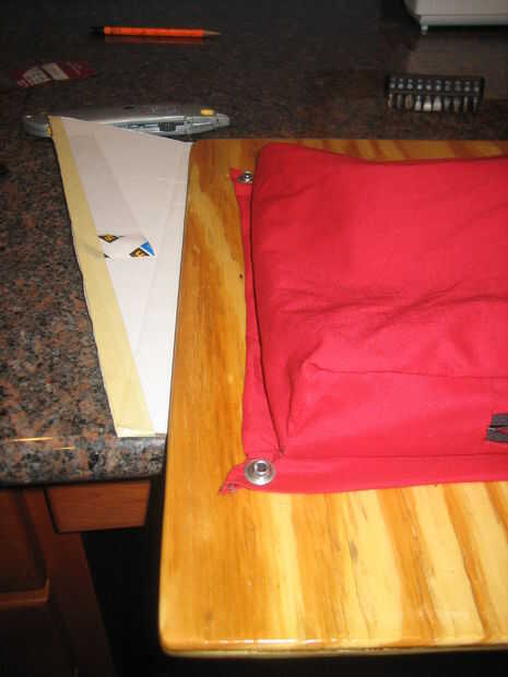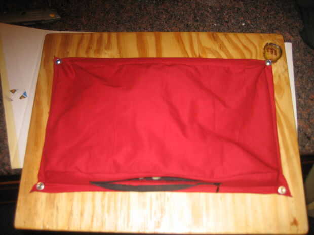 Elegí sujetar el cojín a la bandeja con cuatro tornillos. Para acomodar los tornillos cosí en una brida (o tira) alrededor del perímetro del bolso del cojín. Los tornillos irían a través del reborde en cada esquina. Consulte la primera imagen de un visual de la brida. Centrado el cojín en la bandeja se realizó midiendo y marcando las ubicaciones de los tornillos con una marca de lápiz.