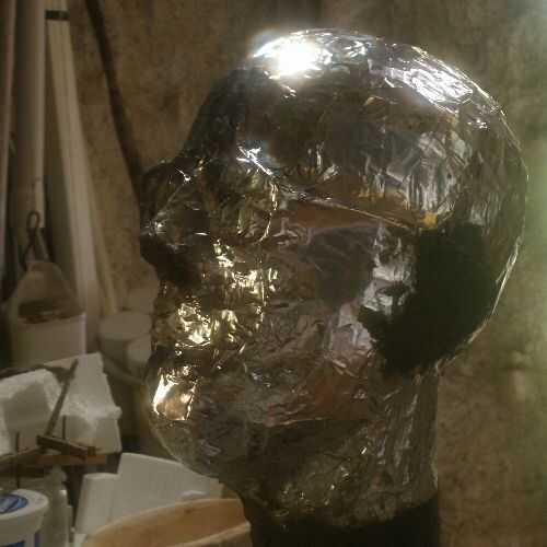 Yo estoy haciendo máscaras con una nueva técnica con hilo y pegamento caliente del derretimiento sobre una base de arcilla (ver: Construyo la arcilla sobre este núcleo central, para asegurarse de que mi cabeza se ajuste de la máscara acabada. Después de quitar la capa de máscara, la arcilla es re hidratada y reutilizada.