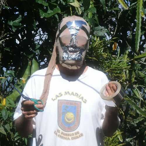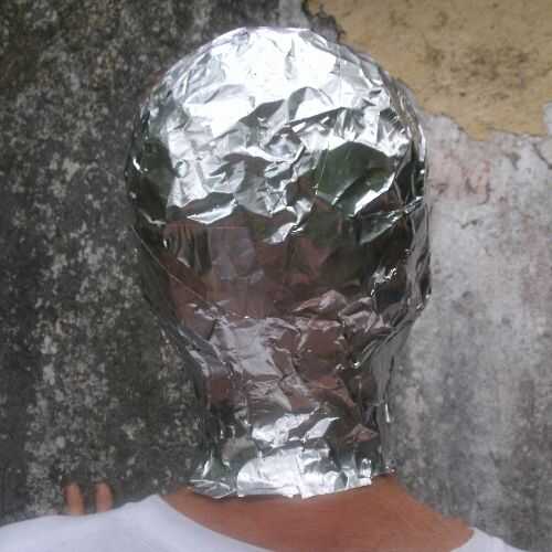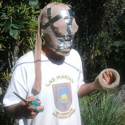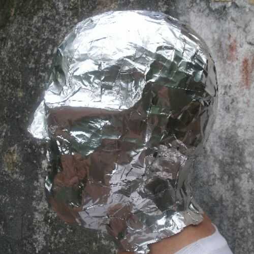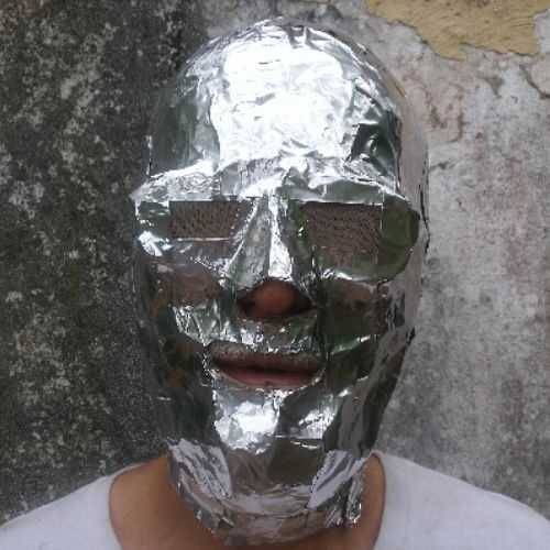 Usé una cinta metálica, como papel de aluminio con pegamento, para cubrir con. La cinta está disponible en tiendas de piezas automotrices para cubrir silenciadores, creo. La cinta es buena en los proyectos del reflector solar, también. Después las áreas alrededor de mi boca y la nariz, amigos terminó cubriendo mi cabeza. Estaba cómodo en el interior, con la respiración fácil. Los agujeros del ojo sobre las gafas fueron los últimos en llegar cubiertos. Cortes de tijera la parte trasera del cuello me ayudó a salir.
