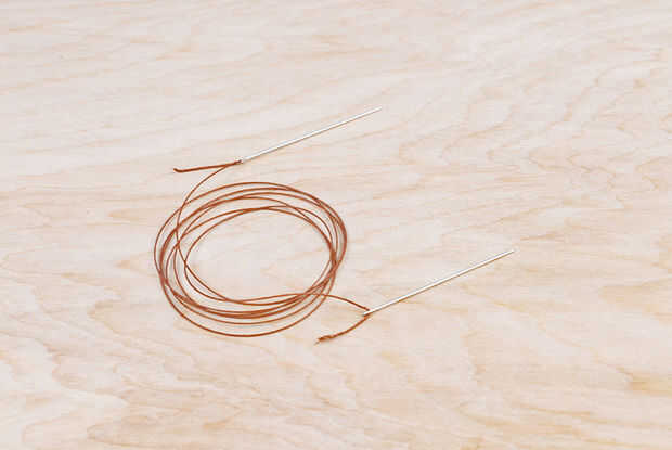 Cortar un extremo del hilo en un ángulo, quitando 1/4" o menos de hilo. Inserte con cuidado en una de las agujas, agarrando el hilo con las puntas de los dedos de la otra mano tan pronto como su a través de la aguja. Jalar el extremo aproximadamente 3/4" más allá del ojo de la aguja y curva detrás hacia el resto del hilo. Repita para la otra aguja.