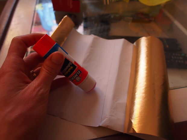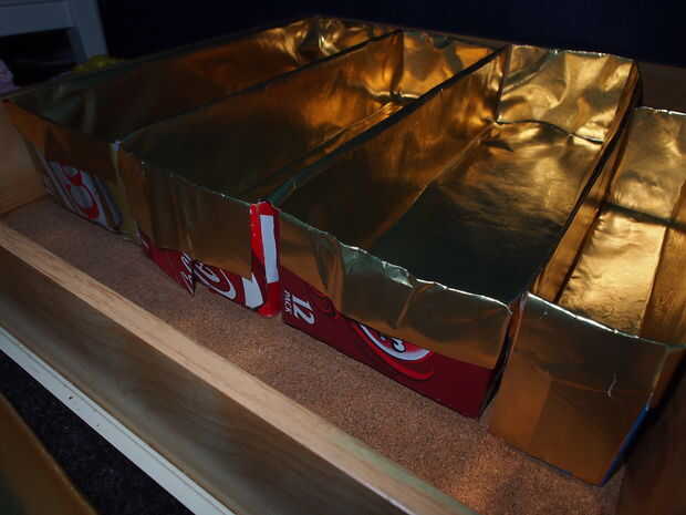 encontré que la que arruga el papel hizo un ajuste más ordenado. Siguió usando el palillo del pegamento para fijarlo a la caja. Si tienes dos piezas que se pegan juntas puede cortar una tira para cubrir ambos cuadros continuamente, en lugar de cubrir cada caja individual. Pegan las cajas de tres soda antes de que cubrí en papel.